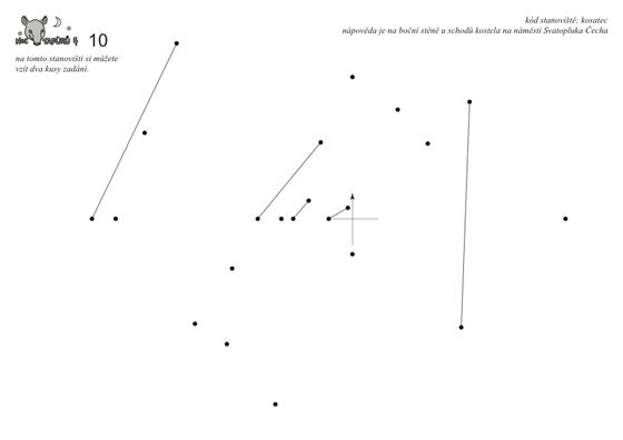 Tvar zadání nápadně připomíná tvar parčíku na Petříně, kde bylo stanoviště umístěno. Ten má, počítáme-li plácek s malovaným bludištěm jako jednu křižovatku, celkem 26 křižovatek. Když do zadání nakreslíme tvar cestiček tak, že pět rovných vychází z Q a pět zatáček sleduje liché řádky zadání, kříží se čáry v textu na písmench, která jsou unikátní. Podle instrukcí pod textem začneme od Z a pohybujeme se po cestičkách podle šipek. Pokaždé když narazíme na kolečko, zapíšeme písmenko z křižovatky na které právě stojíme.